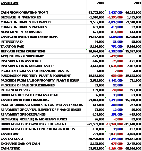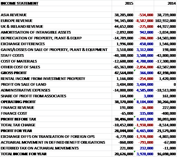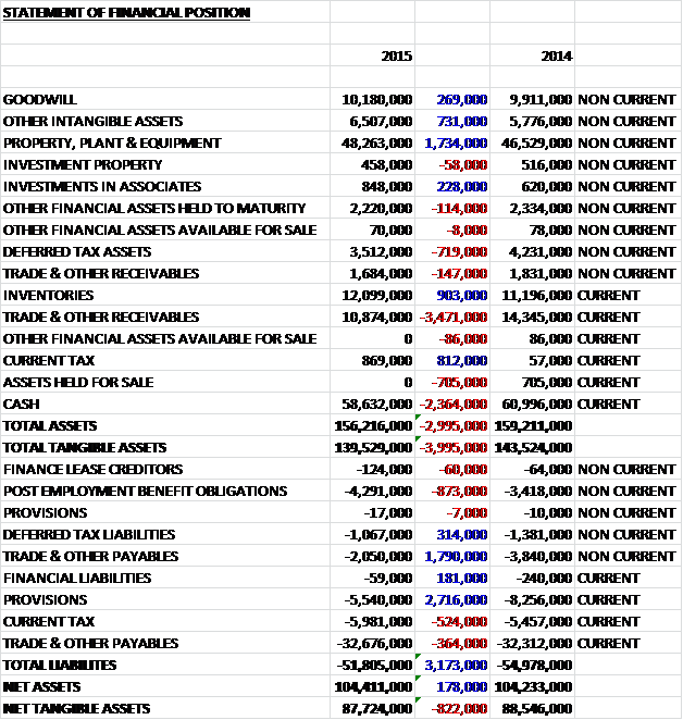 When compared to last year, revenue fell across all regions with a particularly large £8.6M decline in Europe.  Underlying revenue did increase, however, as changes in exchange rates had the effect of reducing revenue by £11M and some £2.7M of falling revenues was due to the decline in the minilab business.  We then see a lower amortisation and depreciation charge, the group gained on exchange differences and there was a one-off £3.5M gain from selling the vacant land at the Bookham site.  In addition, staff costs fell by £3.5M as a result of the restructuring of the former sales and servicing division and cost of materials were down £4.7M due to the winding down of minilab division as well as the reductions achieved through enhanced efficiencies in the supply chain, which left other costs of sales up some £2.9M to give a gross profit just £366K above 2014.  We then see a large decline in admin expenses and a £335K fall in finance costs before a £1.9M growth in the tax bill meant that the profit for the year stood at £28M, an increase of £6.5M when compared to 2014.