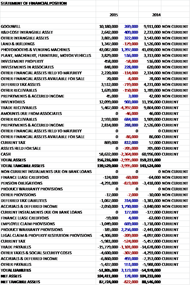 We can see that the in property, plant and equipment was mostly due to a £1.4M increase in photo booths and vending machines and the fall in receivables was driven by the £4.4M decline in trade payables.  As far as liabilities are concerned, the decline in provisions was due to the £2.3M decline in product warranty provisions and a £669K fall in employee claim provisions.  As far as payables are concerned, the increase was driven by a £1.1M growth in trade payables.