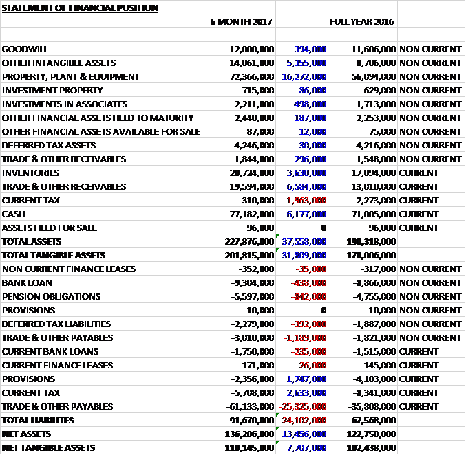 When compared to the end point of last year, total assets increased by £37.6M driven by a £16.3M growth in property, plant and equipment, at least partially related to forex movements; a £6.6M increase in receivables, a £6.2M growth in cash, a £5.4M increase in intangible assets and a £3.6M growth in inventories, partially offset by a £2M fall in current tax assets. Total liabilities also increased during the period as a £26.5M growth in payables was only partially offset by a £2.6M decline in current tax liabilities and a £1.7M fall in provisions. The end result was a net tangible asset level of £110.1M, a growth of £7.7M over the past six months.