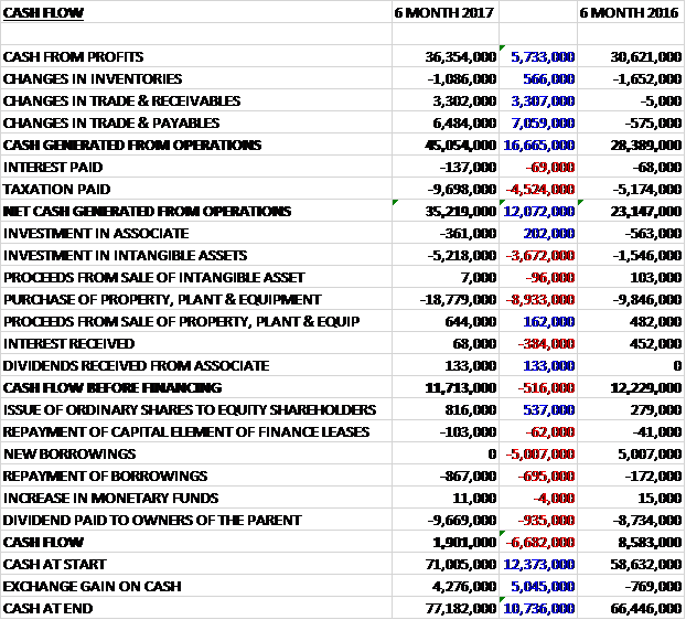 Before movements in working capital, cash profits increased by £5.7M to £36.4M. There was a cash inflow from working capital compared to a small outflow last time but tax payments increased by £4.5M to give a net cash from operations of £35.2M, a growth of £12.1M year on year. The group spent £18.8M on property, plant and equipment, along with £5.2M on intangible assets to give a free cash flow of £11.7M. Of this, £9.7M was spent on dividends which meant that the cash flow for the period was £1.9M and the cash level at the period-end stood at £77.2M.