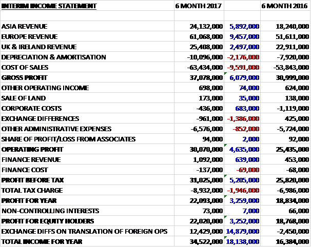 Revenues increased when compared to the first half of last year, mainly as a result of currency movements, with a £9.5M growth in European revenue, a £5.9M increase in Asian revenue and a £2.5M growth in UK & Ireland revenue. Depreciation was up £2.2M and other cost of sales increased by £9.6M to give a gross profit £6.1M above that of last time. Corporate costs reduced by £683K but there was a £1.4M negative shift due to forex movements and other admin expenses were up £852K so that the operating profit increased by £4.6M. The group also increased finance revenue by £639K but tax charges were up £1.9M to give a profit for the period of £22M, a growth of £3.3M year on year.