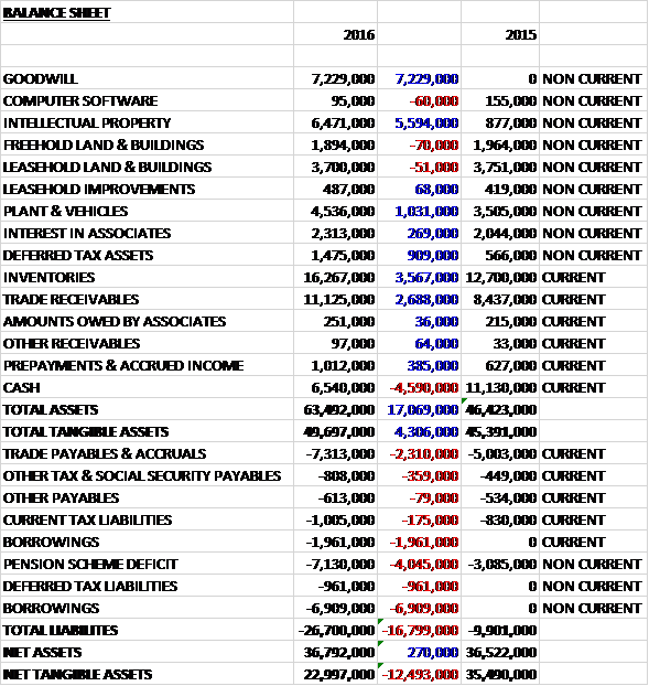 When compared to the end point of last year, total assets increased by £17.1M driven by a £7.2M growth in goodwill, a £5.6M increase in IP, a £3.6M growth in inventories, a £2.7M increase in trade receivables and a £1M increase in the value of plant and vehicles, partially offset by a £4.6M decrease in cash. Total liabilities also increased during the year due to an £8.9M increase in borrowings, a £4M growth in the pension liabilities and a £2.3M increase in trade payables and accruals. The end result was a net tangible asset level of £23M, a decline of £12.5M year on year.
