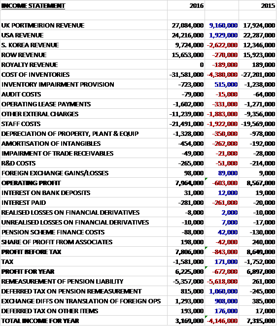 Portmeirion has now released their final results for the year ended 2016.