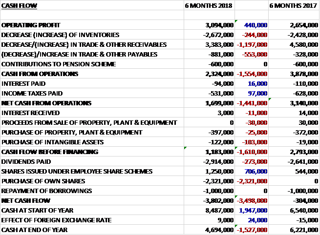 Before movements in working capital, cash profits increased by £440K to £3.1M. There was a cash outflow from working capital and even after tax payments reduced by £97K the net cash from operations was £1.7M, a decline of £1.4M year on year. The group spent £397K on tangible assets and £122K on intangibles to give a free cash flow of £1.2M. This did not cover the £2.9M paid out in dividends and the group also purchased a net £1.1M of their own shares, presumably to satisfy share schemes, and repaid £1M of loans to give a cash outflow of £3.8M and a cash level of £4.7M at the period-end.