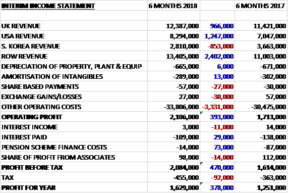 Revenues grew when compared to the first half of last year as an £853K decline in South Korean revenue was more than offset by a £1.3M increase in US revenue, a £966K growth in UK revenue and a £2.4M increase in ROW revenue. Operating costs also increased to give an operating profit £393K above last time. There was a modest decline in finance costs, mainly due to lower pension scheme costs but tax charges were up £92K which meant that the profit for the period was £1.6M, a growth of £378K year on year.