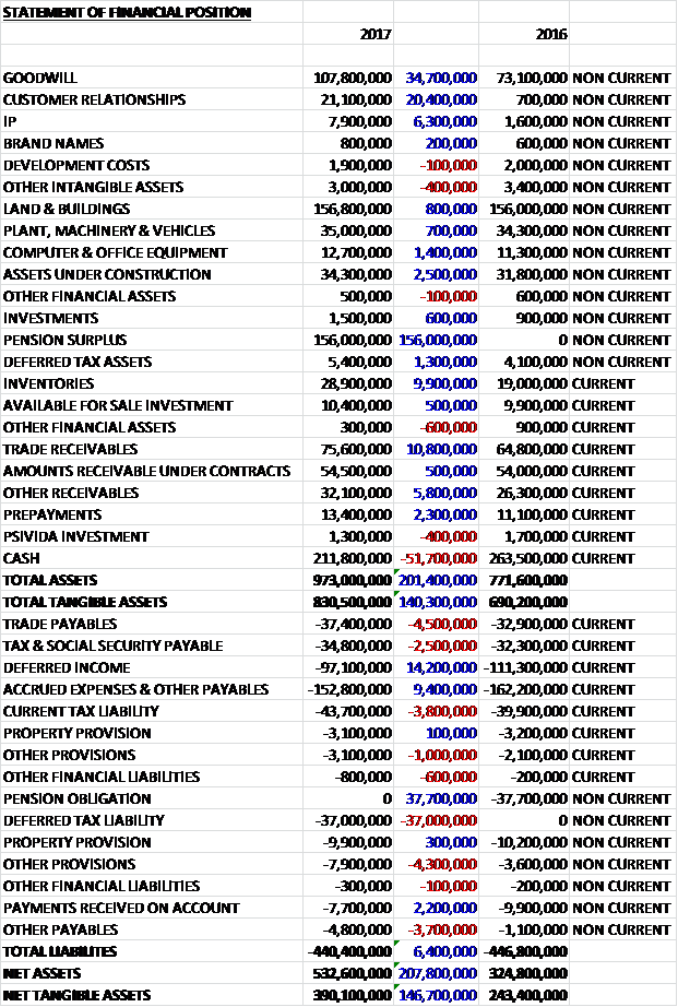 When compared to the end point of last year total assets increased by £201.4M, driven by a £156M pension surplus due to the performance of interest rate hedges, a £34.7M growth in goodwill, a £20.4M increase in customer relationships, a £10.8M growth in trade receivables, a £9.9M increase in inventories, a £6.3M increase in the value of IP, and a £5.8M growth in other receivables, partially offset by a £51.7M decline in cash. Total liabilities declined during the year as the £37.7M decline in the pension surplus, a £14.2M fall in deferred income and a £9.4M fall in accrued expenses and other payables was partially offset by a £37M increase in deferred tax liabilities, a £4.5M growth in trade payables and a £4.3M increase in other provisions. The end result was a net tangible asset level of £390.1M, a growth of £146.7M year on year.