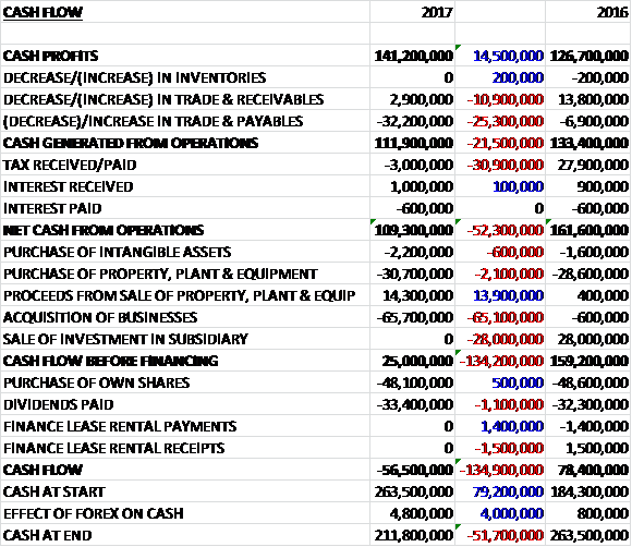 Before movements in working capital, cash profits increased by £14.5M to £141.2M. There was a cash outflow from working capital due to a decrease in payables and after tax swung to a charge, a detrimental movement of £30.9M, the net cash from operations came in at £109.3M, a decline of £52.3M year on year. The group spent £30.7M on property, plant and equipment, £2.2M on intangibles and £65.7M on acquisitions but received £14.3M on the sale of some property which gave a free cash flow of £25M. This did not cover the returns to shareholders, however, with a £33.4M dividend payment and £48.1M of share re-purchases meaning there was a cash outflow of £56.5M and a cash level of £211.8M at the year-end.