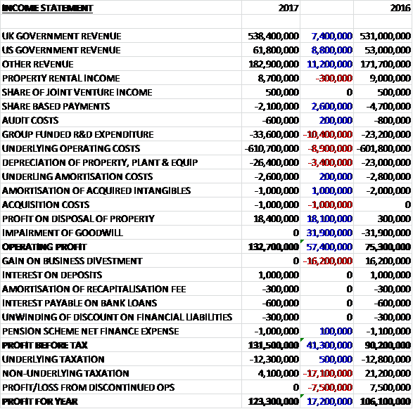 Revenues increased when compared to last year as a £300K decline in property rentals was more than offset by an £8.8M growth in US government revenue, a £7.4M increase in UK government revenue and an £11.2M increase in other revenues. Share based payments fell by £2.6M but group funded R&D exposure increased by £10.4M and other underlying operating expenses grew by £8.9M. Depreciation was also up £3.4M and there was £1M of acquisition expenses but the amortisation of acquired intangibles declined by £1M, there was an £18.1M increase in the profit on property disposals and there was no goodwill impairments which accounted for £31.9M last year. All of this meant that the operating profit grew by £57.4M. Conversely there was no gain on business divestments which brought in £16.2M in 2016, non-underlying tax income declined by £17.1M and there was no profit from the discontinued operations, which was £7.5M last time. Profits overall increased by £17.2M.