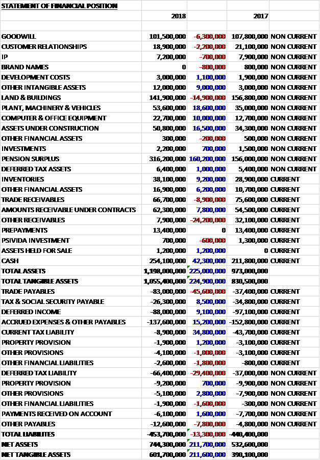 When compared to the end point of last year, total assets increased by £225M driven by a £160.2M increase in the pension surplus, a £42.3M growth in cash, an £18.6M increase in plant & machinery, a £16.5M growth in assets under construction and a £10M increase in office equipment, partially offset by a £24.2M decrease in other receivables relating to the insurance payout following the unfavourable court decision in the US, and a £14.9M decline in land and buildings. Total liabilities also increased during the year as a £34.8M decline in current tax liabilities relating to the settlement of a tax liability in the US related to an unfavourable court decision and a £15.2M fall in accrued expenses and other payables were more than offset by a £45.6M increase in trade payables and a £29.4M growth in deferred tax liabilities. The end result was a net tangible asset level of £601.7M, a growth of £211.6M year on year.