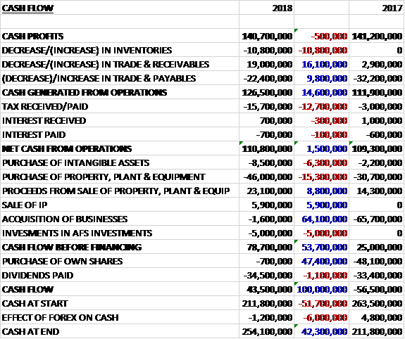 Before movements in working capital, cash profits declined by just £500K to £140.7M. There was a cash outflow from working capital but this was lower than last time so even after tax payments increased by £12.7M the net cash from operations was £110.8M, a growth of £1.5M year on year. The group spent £8.5M on intangible assets, £46M on fixed assets, £5M on available for sale investments and £1.6M on acquisitions. Offsetting this the group brought in £23.1M from the sale of fixed assets and £5.9M from the sale of IP to give a free cash flow of £78.7M. Of this, £34.5M went on dividends to give a cash flow of £43.5M and a cash level of £254.1M at the year-end.