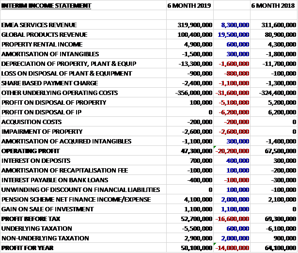 Revenues increased when compared to the first half of last year due to a £19.5M growth in global products revenue, an £8.3M increase in EMEA Services revenue and a £600K growth in property rental income.  Depreciation was up £1.6M, share based payments increased by £1.1M and other underlying operating costs grew by £31.6M.  We also see a £5.1M reduction in the profit on property disposals, a £6.2M fall in the profit of IP sales and a £2.6M property impairment which meant that the operating profit declined by £20.2M.  Pension scheme income increased by £2M, there was a £1.1M gain on the sale of an investment and tax charges reduced by £2.6M due to a £2M increase in tax income related to share based payments, to give a profit for the period of £50.1M, a decline of £14M year on year.