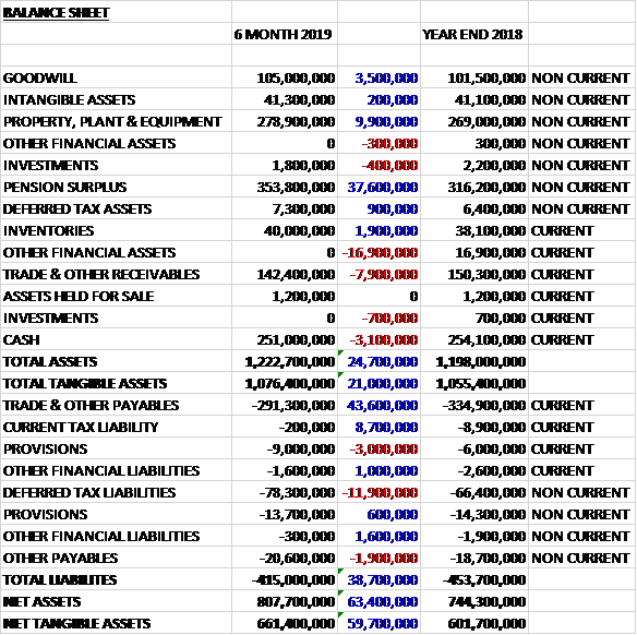 When compared to the end point of last year, total assets increased by £24.7M driven by a £37.6M increase in the pension surplus, a £9.9M growth in property, plant and equipment, a £3.5M increase in goodwill and a £1.9M growth in inventories, partially offset by a £16.9M reduction in other financial assets, a £7.9M fall in receivables and a £3.1M decrease in cash.  Total liabilities declined during the period as an £11.9M increase in deferred tax liabilities and a £2.4M growth in provisions was more than offset by a £43.6M decline in payables and an £8.7M decrease in current tax liabilities.  The end result was a net tangible asset level of £661.4M, a growth of £59.7M over the past six months.