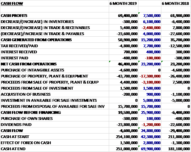 Before movements in working capital, cash profits increased by £7.5M to £69.4M.  There was a cash outflow from working capital but this was less than last time and after tax payments declined by £7.7M the net cash from operations was £46.4M.  The group spent £43.7M on property, plant and equipment along with £4.6M on intangible assets but they recouped £15.7M from the sale of an available for sale investment, £4.4M from the sale of fixed assets and £1.5M from the sale of an investment to give a free cash flow of £19.5M.  This didn’t cover the £23.8M paid out in dividends so there was a cash outflow of £4.6M and a cash level of £251M at the period-end.
