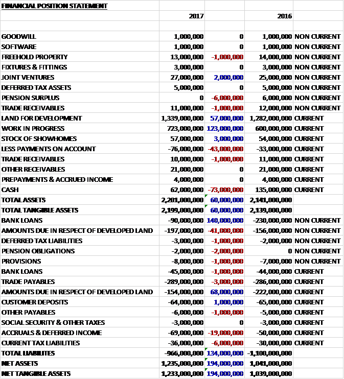 When compared to the end point of last year, total assets increased by £60M driven by a £137M increase in inventories, partially offset by a £73M decrease in cash. Total liabilities declined during the year as a £19M growth in accruals and deferred income was more than offset by a £42M decline in bank loans and a £27M fall in amounts due in respect of developed land. This all meant that net tangible assets came in at £1.233BN, a growth of £194M year on year.