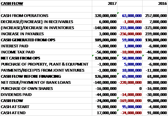 Before movements in working capital, cash profits increased by £63M to £320M. There was a cash outflow from working capital and after tax payments increased by £10M there was a net cash from operations of £128M, a growth of £50M year on year. The group spent just £2M on capex to give a free cash flow of £126M. This was used to pay back £44M of dividends, buy £16M of their own shares and to pay back £140M in loans to give a cash outflow of £74M and a cash level of £17M at the year-end.