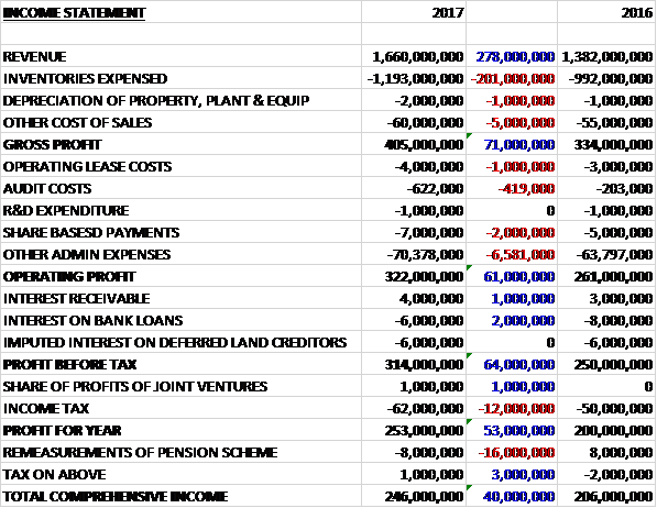 Revenue increased by £278K and inventory costs grew by £201M with a £1M increase in depreciation and a £5M growth in other cost of sales which meant that the gross profit was £71M higher. Operating lease costs grew by £1M, share based payments were up £2M and other admin expenses increased by £6.6M to give an operating profit £61M higher. Interest receipts increased by £1M and interest payments fell by £2M but tax charges grew by £12M which meant that the profit for the year was £253M, a growth of £53M year on year.