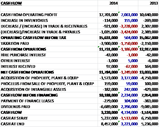 Before movements in working capital, cash profits increased by £7.1M to £17.7M before modestly adverse movements in payables and receivables meant that before tax, the operating cash flow increased by £564K to £15.6M which became £11.8M after tax and interest were taken into account. This was easily enough to cover capital expenditure so that free cash flow was an impressive £10.2M, an increase of £2.2M when compared to last year. The bulk of this cash was spent on dividends and there was still a cash inflow of £3.2M to give a cash pile of £8.5M – pretty impressive stuff.