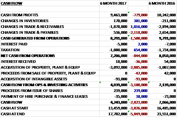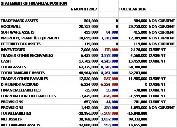 Before movements in working capital, cash profits declined by £779K to £9.5M. There was also a cash outflow from working capital but tax payments reduced by £654K to give a net cash from operations of £7.2M, a decline of £844K year on year. The group spent £3.1M on property, plant and equipment, of which £2.4M related to the new factory, along with just £93K on intangible assets to give a free cash flow of £4M. No dividends were paid but this doesn’t cover the £6.2M accrued. Due to the fact that the dividend payment wasn’t made in the period there was a cash flow of £4.2M and a cash level of £17.7M at the period-end.