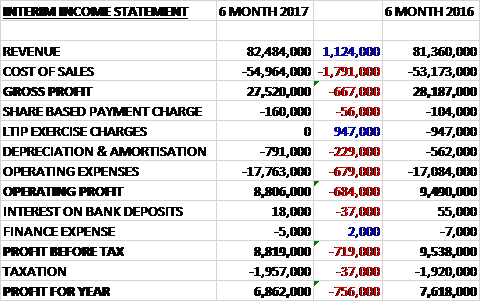 Revenue increased by £1.1M when compared to the first half of last year but cost of sales grew by £1.8M so the gross profit fell by £667K. There was no LTIP exercise charge, which was £947K last time but share based payments were up £56K, depreciation and amortisation grew by £229K and other operating expenses were £679K higher so the operating profit declined by £684K. Interest income fell by £37K and tax charges grew by £37K which gave a profit for the period of £6.9M, a decline of £756K year on year.