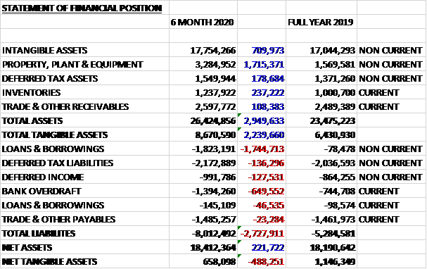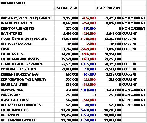 When compared to the end point of last year, total assets increased by £3.1M driven by a £5M growth in inventories and a £4.8M recognition of right of use assets, partially offset by a £5M decline in cash and a £2.7M decrease in receivables. Total liabilities also increased during the period as a £1.3M decrease in payables was more than offset by a £3M growth in borrowings and a £4.8M recognition of lease liabilities. The end result was a net tangible asset level of £32.8M, a decline of £3.9M over the past six months.