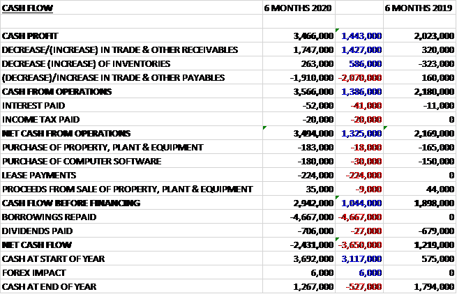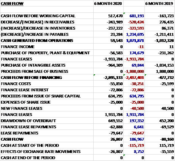 Before movements in working capital, cash profits declined by £1.5M to £1.6M. There was a cash outflow from working capital and despite tax payments reducing by £101K there was a £3.7M outflow of cash from operations, a deterioration of £5.4M year on year. The group spent £363K on an associate, £793K on fixed assets and £135K on intangible assets to give a cash outflow of £5M before financing. They took out £3M of new loans to pay the £3.1M of dividends so there was a cash outflow of £5M for the half year and a cash level of £2.2M at the period-end.