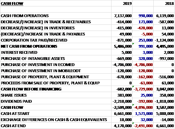 Before movements in working capital, cash profits increased by £122K to £2.4M. There was a small cash outflow from working capital but tax payments fell by £200K and interest payments were down £13K to give a net cash from operations of £2.2M, a growth of £209K year on year. The group spent £205K on assisted acquisitions support but there was negligible other capex so the free cash flow was £2.1M. Of this, £450K was used to repay loans and £1.5M was paid out in dividends to give a cash flow of £59K and a cash level of £3.9M at the period-end.