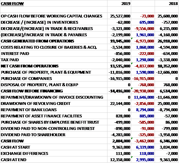 Before movements in working capital, cash profits increased by £5.6M to £7.4M. There was a cash inflow from working capital and despite increases in interest payments and tax the net cash from operations was £9M, an improvement of £15.9M year on year. The group spent £848K on intangible assets and £2.3M on fixed tangible assets to give a free cash flow of £6.1M. Of this, £3.3M was used to repay borrowings, £1.1M paid out in dividends and £1M went on finance lease payments to give a cash flow of £1.3M and a cash level of £8.1M at the year-end.
