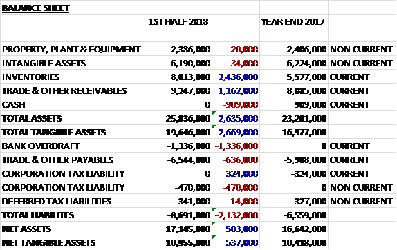When compared to the end point of last year, total assets increased by £2.6M, driven by a £2.4M growth in inventories and a £1.2M increase in receivables, partially offset by a £909K decline in cash. Total liabilities also increased during the period due to a £1.3M increase in the bank overdraft, a £636K growth in payables and a £146K increase in the corporation tax liability. The end result was a net tangible asset level of £11M, a growth of £537K over the past six months.