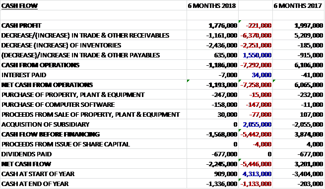 Before movements in working capital, cash profits declined by £221K to £1.8M. There was a cash outflow from working capital and after interest payments declined by £34K, the net cash outflow from operations was £1.2M. The group also spent £247K on property, plant and equipment along with £158K on intangible assets to give a cash outflow of £1.6M before financing. They also spent £677K on dividends to give a cash outflow for the period of £2.2M and a cash level of -£1.3M at the period-end.