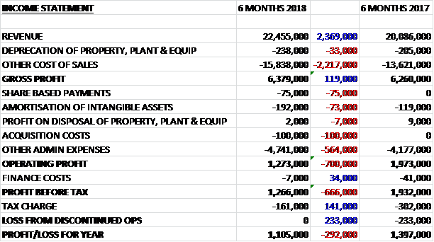 Revenues increased by £2.4M when compared to the first half of last year. Cost of sales grew by £2.4M to give a gross profit £119K higher. Share based payments grew by £75K, amortisation increased by £73K, there was £100K of acquisition costs and other admin expenses grew by £564K reflecting the planned investment in sales staff and the full period cost contribution from Creasefield, which meant that the operating profit was down £700K. Finance costs declined by £34K, however, and tax charges fell by £141K to give a profit for the period of £1.1M, a decline of £525K year on year.
