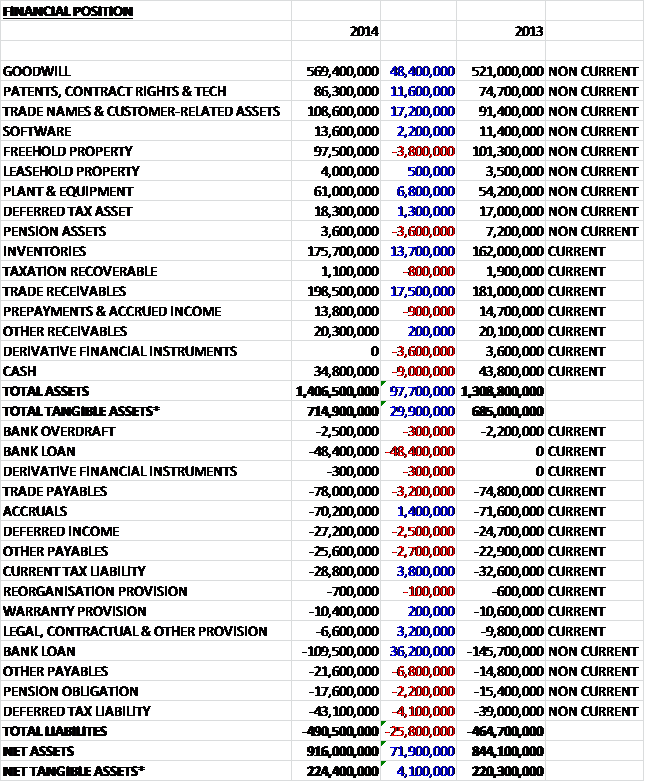 Before movements in working capital, cash profits fell by £14.6M to £218.7M. The group then saw a fairly large outflow of working capital, mainly due to a £16.3M increase in receivables and after a much lower tax bill, the net cash from operations stood at £155.2M, an increase of £2.9M when compared to last year. The group spent a net £25M on fixed assets relating to investments in infrastructure projects in the Netherlands and a new ERP system for Omega Engineering, and some £6.6M on interest (why that is included in financing I do not know…) along with a £91.6M spend on acquisitions and even after all of this, there was a £32.3M increase in cash before financing items. This was not enough to cover the dividend though and after a net £12.6M of new loans the cash outflow for the year was £7.1M and the cash level at the year-end was £32.3M.