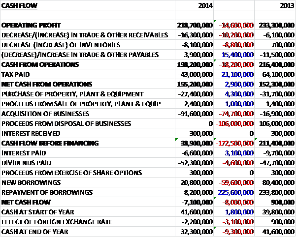 Overall then this seems to have been a fairly slow year for the group. Pre-tax profits fell year on year, even when the effect of the loan re-translations (I still don’t really know what that is) and last year’s disposal are removed. Net assets did increase modestly, but that was due to the growth in intangible assets and although net operational cash flow grew year on year (due to much lower tax payments) the underlying cash profit fell. Despite this, the group is still very cash generative and even had free cash left over after the £91M spent on acquisitions – sadly this was not enough to cover the dividends though.