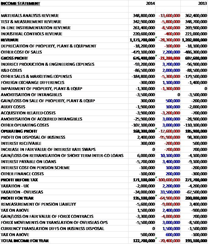 When compared to last year, total revenues fell by £28.3M to £1.173BN with declines in all business areas, particularly materials analysis and in-line instrumentation. Cost of sales also fell, however, to give a gross profit some £21.2M below that of last year. We also fee modest falls in R&D costs and indirect production and engineering expenses but sales and marketing costs increased year on year. There was a £1.1M positive swing in foreign exchange and a £1.3M impairment of fixed assets along with a £3.2M increase in acquisition related costs, which was counteracted somewhat by a £3M fall in the amortisation of acquired intangibles, although these remained substantial at £25.9M. After a decline in other operating costs, group operating profit stood at £168.3M, a decline of £17.6M year on year.