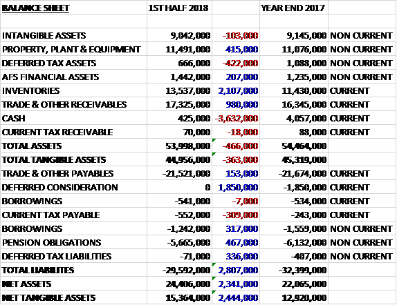 When compared to the end point of last year, total assets declined by £466K driven by a £3.6M reduction in cash and a £422K fall in deferred tax assets, partially offset by a £2.1M growth in inventories, a £980K increase in receivables and a £415K growth in property, plant and equipment. Total liabilities also decreased during the period as a £309K increase in current tax payables was more than offset by a £1.9M fall in deferred consideration, a £467K reduction in pension obligations, a £336K decline in deferred tax liabilities and a £310K fall in borrowings. The end result was a net tangible asset level of £15.4M, a growth of £2.4M over the past six months.