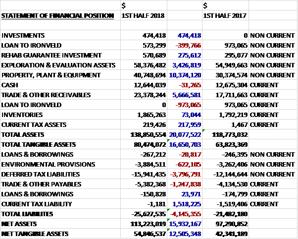 When compared to the end point of last year, total assets increased by $20.1M driven by a $10.4M growth in property, plant and equipment, a $5.7M increase in receivables and a $3.4M growth in exploration and evaluation assets, partially offset by a $1.4M decrease in the loan to Ironveld. Total liabilities also increased during the period as a $1.5M fall in current tax liabilities was more than offset by a $3.8M growth in deferred tax liabilities and a $1.3M increase in payables. The end result was a net tangible asset level of $54.8M, a growth of $12.5M over the past six months.