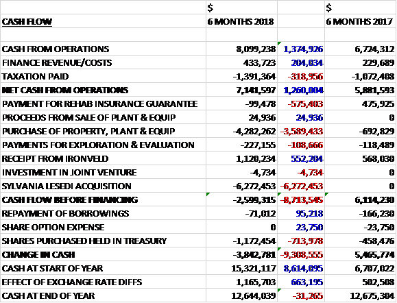Before movements in working capital, cash profits increased by $1.4M to $8.1M. Finance revenue increased by $204K but tax payments increased by $319K to give a net cash from operations of $7.1M, a growth of $1.3M year on year. The group spent $4.3M on property, plant and equipment as a result of the first two Project Echo modules being commissioned along with $227K on exploration and $6.3M on the Lesedi acquisition but they brought in $1.1M from loan receipts from Ironveld to give a cash outflow of $2.6M before financing. The group also purchased $1.2M of shares to hold in treasury which meant that the cash outflow for the period was $3.8M and the cash level at the period-end was $12.6M.