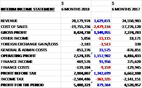 Revenues increased by $3.6M when compared to the first half of 2017. Cost of sales also increased to give a gross profit $1.1M higher. General and admin costs were slightly lower which meant the operating profit was $1.2M higher. There was a $94K increase in finance income but tax charges grew by $363K to give a profit for the half year of $5.4M, a growth of $879K year on year.