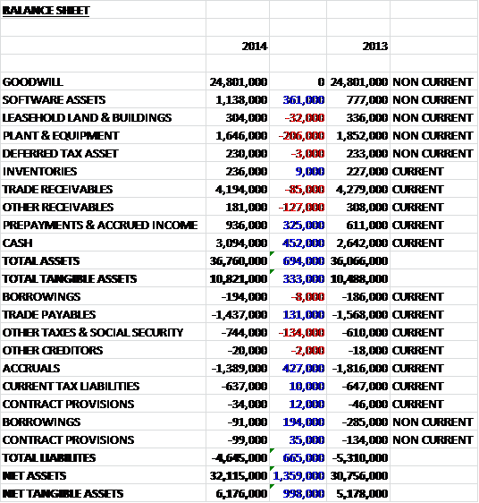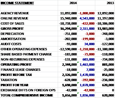 When compared to last year revenues increased, driven by a £4.5M growth in online revenue, somewhat offset by a £1.8M fall in agency revenue.  Cost of sales increased slightly to give a gross profit some £2.3M higher.  Depreciation remained flat but there was a much larger amortisation charge this year which, alongside other higher operating expenses due to a growth in staff costs, and flattered somewhat by a £603K reduction in non-recurring expenses, this year relating to the costs of disposing of the majority share in the Australian operation (£120K is expected to be charged next year), meant that operating profit was £1.5M higher.  After tax, this fell to £1.1M higher at £1.7M, still a pretty decent result.