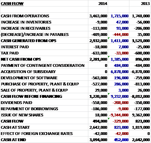 Before movements in working capital, cash profits were some £1.7M higher at £3.5M.  A decrease in payables due to the payment of closure costs at Thetford was responsible to a decline to £2.9M after working capital considerations and after tax the net cash from operations was £2.3M, a £1.4M increase when compared to 2013.  Last year the group spent £6.9M on an acquisition but this year, the only capital expenditure was a £563K software development costs and a net £498K spent on the purchase of property, plant and equipment relating to new print and finishing equipment and this level of investment is expected to continue into next year.  This gave a free cash flow of £1.2M which was ample cash with which to pay out £558K in dividends and pay back £186K of loans so that the cash flow for the year was a decent £494K.