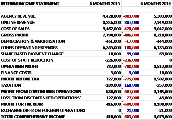 When compared to the first half of last year, revenues were broadly flat with an increase in online sales offsetting a similar decline in agency revenue. Cost of sales, however, increased so that gross profit was £416K lower. Operating expenses also increased and there was a one-off £226K charge for staff redundancies, counteracted by a lower taxation. The profit from continuing operations was £538K, less than half what it was this time last year and the disposal charges meant that the profit for the half year was some £684K lower at £416K.