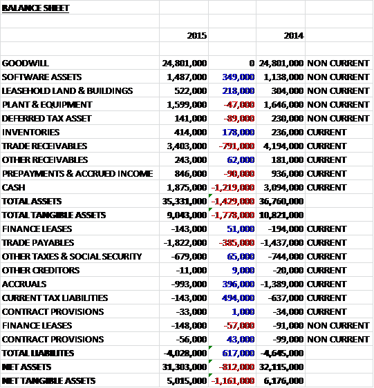 After a review of the operational structure, the group has reduced headcount which led to restructuring and redundancy costs of £590K. In addition, all of the London based businesses have been relocated during the year which resulted in a one-off expense of £120K. The reduction in operating profits meant that the headroom with regards goodwill impairment was reduced so I would not be surprised to see a write-down at some point in the future. I don’t generally include Goodwill in my analysis of a balance sheet, though, so this has limited effect as far as I am concerned (although the reduction in predicted operating profit going forward is clearly a concern). Of the group’s capital expenditure this year, £570K was spent on printing equipment and IT, £280K was spent on leasehold improvements and £640K was spent on software. Investments in equipment and IT is likely to remain flat going forward but should reduce in software and cease entirely with regards to leasehold improvements, so capital expenditure should reduce in 2016.