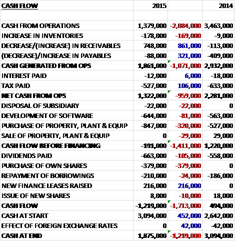 Before movements in working capital, cash profits were some £2.1M lower than in 2014, but this was improved somewhat by a decrease in receivables due to a higher proportion of customers paying upfront and online with credit and debit cards, before a lower tax bill meant that net cash from operations was nearly £1M lower at £1.3M. This was not quite enough to cover capital expenditure of £847K of intangible assets and £644K of intangibles so there was no free cash flow this year. The group then paid £663K on dividends and £379K of cash it barely had on the purchase of its own shares with the end result being a £1.2M cash outflow to leave a cash level of £1.9M at the year-end with overdraft headroom of £1M.