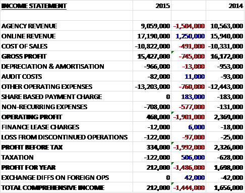 Overall revenues fell as a £1.25M increase in online revenue was more than offset by a £1.5M decline in agency revenue. Cost of sales then increased to give a gross profit some £745K lower than last year. There was also an increase in underlying operating expenses as well as a £577K growth in non-recurring costs relating to the downsizing of Tangent Snowball, rationalising Ravensworth and relocation expenses, which left the operating profit at just £468K, a decline of £1.9M. This fall widened to £2M when the loss from the discontinued operations is taken into account and after a much smaller tax bill, the profit for the year stood at just £212K, a decline of £1.5M when compared to 2014.