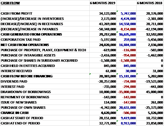 Before movements in working capital, cash profits increased by £5.7M to £34.1M. There was a cash outflow from working capital but this was lower than last time and after tax payments declined by £259K the net cash from operations was £24M, a growth of £16.9M over the past six months. The group spent £619K on fixed assets, £2.4M on intangible assets and a net £663K on acquisitions to give a free cash flow of £20.4M. This only just covered the dividends of £20.3M but the group also purchased £4.7M of their own shares and paid out £735K in interest. After a £10M drawdown of borrowings, there was a cash flow of £4.6M and a cash level of £32.8M at the period-end.