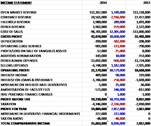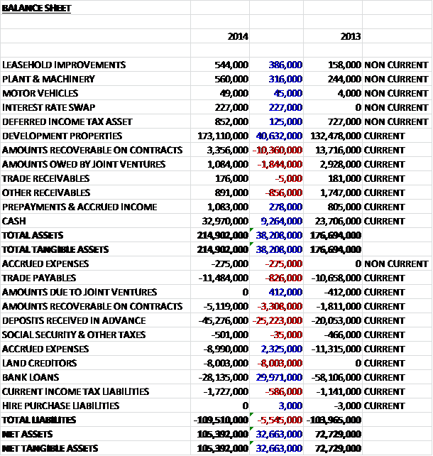 Overall revenues declined when compared to last year with a £1.1M increase in by far the largest sector, the open market, offset by a £2.9M decline in contract revenue. Cost of sales also declined, in part due to the lack of inventory write down that cost £1.9M in 2013, to give a gross profit some £10.7M higher than last year. We also see an increase in admin expenses, mainly due to higher employee costs in constructing increasing numbers of homes, counteracted by a decrease in selling expenses which are expensed as they occur and not necessarily when revenue is recognised when the homes complete (mostly relating to agent’s commission), so that operating profit is a similar £10.6M higher. There was a £758K increase in loan interest and a more than doubling tax bill to give a profit for the year twice that of in 2013 at £14.9M.