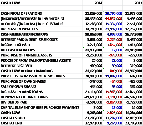 Before movements in working capital, at £21.9M cash profits were some £10.8M higher than last year. A large increase in inventories was offset by favourable movements in receivables and payables so that cash generated from operations was £30.9M, a £4.1M increase on 2013. There was higher interest and tax paid so that net cash from operations was actually flat on last year at £21.9M. Only £1.3M was spent on the purchase of tangible assets and free cash flow was £21.1M, a slight fall. The group then seems to have shuffled debt around so that a £20.4M placing was used to repay some bank loans and pay £3.6M of dividends so that the cash flow was £9.3M and the cash levels at the end of the year were £9.3M. It is pleasing to see debt reduced but a placing of shares was needed to do it.