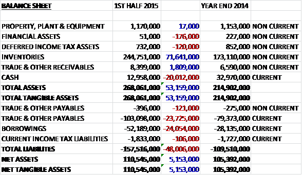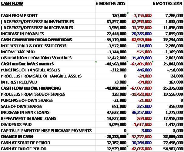 Before movements in working capital, cash profits were some £7.2M lower at just £130K. A huge increase in inventories, however, meant that there was a cash outflow of £55.7M. After the £17.5M contribution from joint ventures, somewhat offset by interest and tax, there was still a net cash outflow of £41.6M from operations. A small purchase of tangible assets meant that free cash flow was a negative £41.8M. In order to balance the books somewhat there was a net £24M increase in loans, partially offset by a £3M dividend payment to give a cash outflow for the period of £20.2M. Considering the cash position at the end of the period was £12.5M, this looks a little precarious, although it should be noted that this situation was flagged up by management in the last update.