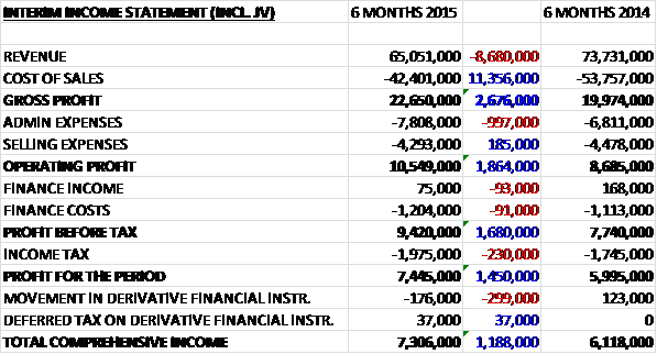 When compared to the first half of last year, revenues fell by some £8.7M in H1 2015 due to the timing of completions. Cost of sales also fell, though, to give a gross profit £2.7M up. Admin expenses increased, as a result of higher staff costs, but selling expenses showed a small decline so that operating profit was £1.9M higher. A small adverse movement in finance income/costs due to non-utilisation fees on the credit facility and a small increase in tax meant that the profit for the period of £7.4M was £1.5M higher than during the same period of last year.