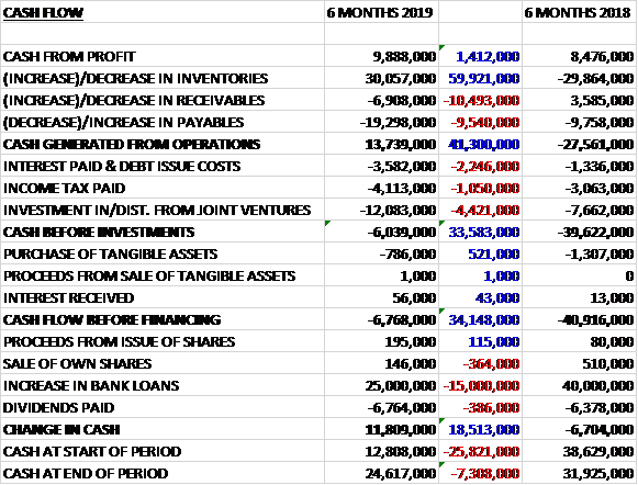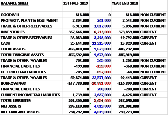 When compared to the end point of last year, total assets increased by £9.7M driven by an £11.3M growth in cash and a £4.3M increase in receivables, partially offset by a £6.2M decline in inventories. Total liabilities also increased during the period as a £23M decline in payables and a £2.7M decrease in current tax liabilities was more than offset by a £30.9M increase in borrowings. The end result was a net tangible asset level of £234.3M, a growth of £4M over the past six months.