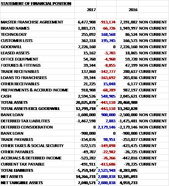 When compared to the end point of last year, total assets declined by £433K, driven by a £913K impairment of the master franchise agreement, a £164K fall in loans to franchisees and a £143K decrease in trade receivables, partially offset by a £549K increase in cash, a £196K growth in the value of customer lists and a £169K increase in technology relating to new websites. Total liabilities also decreased during the period as a £149K increase in other taxes and social security and a £414K growth in current tax payables were more than offset by a £2.2M decrease in deferred consideration and a £900K fall in the bank loan. The end result was a net tangible asset level of £7M, an increase of £2.1M year on year.
